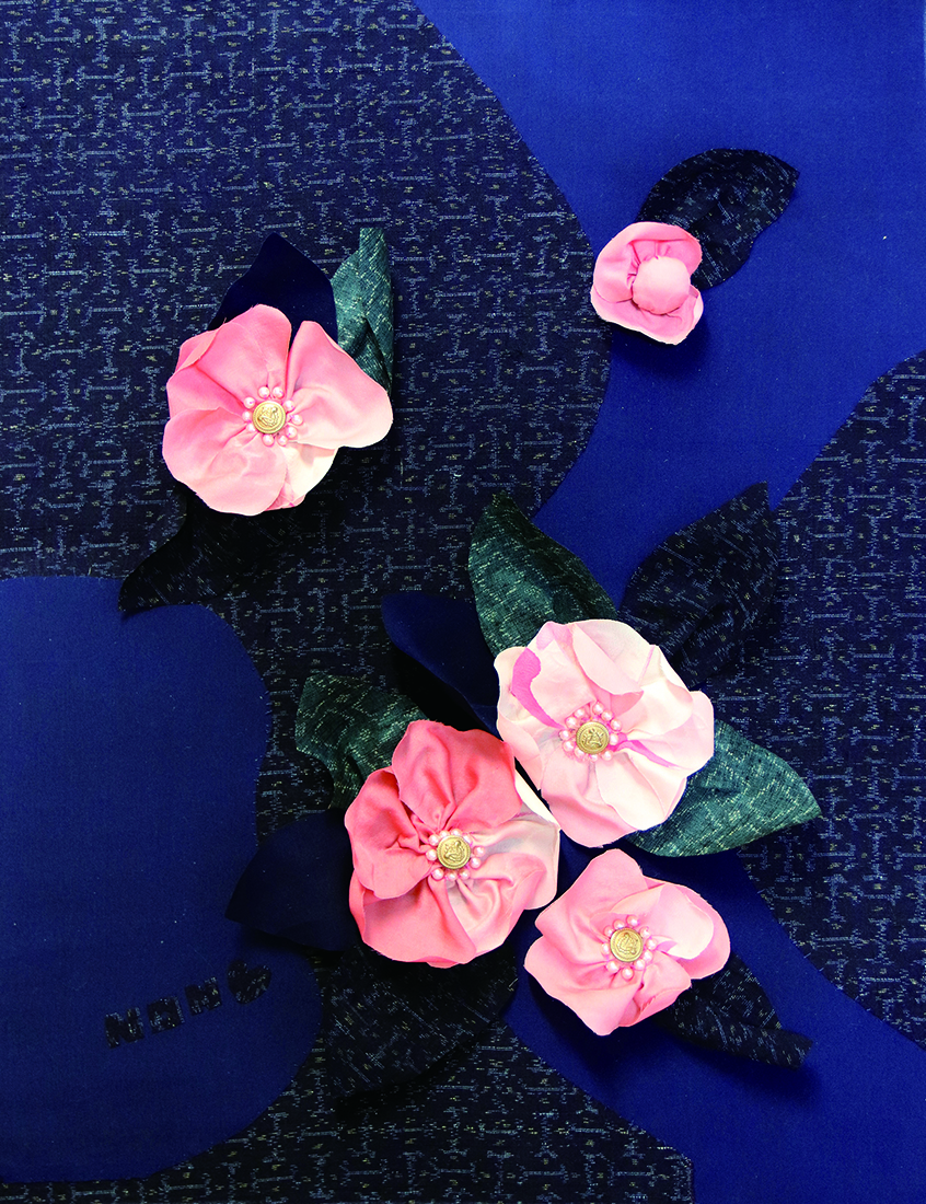 焼き物の青い顔料、呉須(ごす)、素焼きした白地の器にコバルゴ顔料の呉須で絵付けしたものを染付といい、江戸時代に大陸から九州の有田に伝わったといわれています。明るいものから濃い青まで色味の幅はありますが、藍色と共に日本を代表するジャパンブルーです。この呉須の青が呉須色。添えられている花は山茶花(サザンカ)。椿(ツバキ)に似ているツバキ科の植物で、“山茶花 山茶花 咲いた道… ”という歌詞がある童謡「たき火」でも有名です。椿より一足早く咲く初冬の花で、種類はたくさんありますが、生け垣などでよく見かけます。花言葉は、ひたむきな愛。楚々とした呉須のブルーによく似合います。